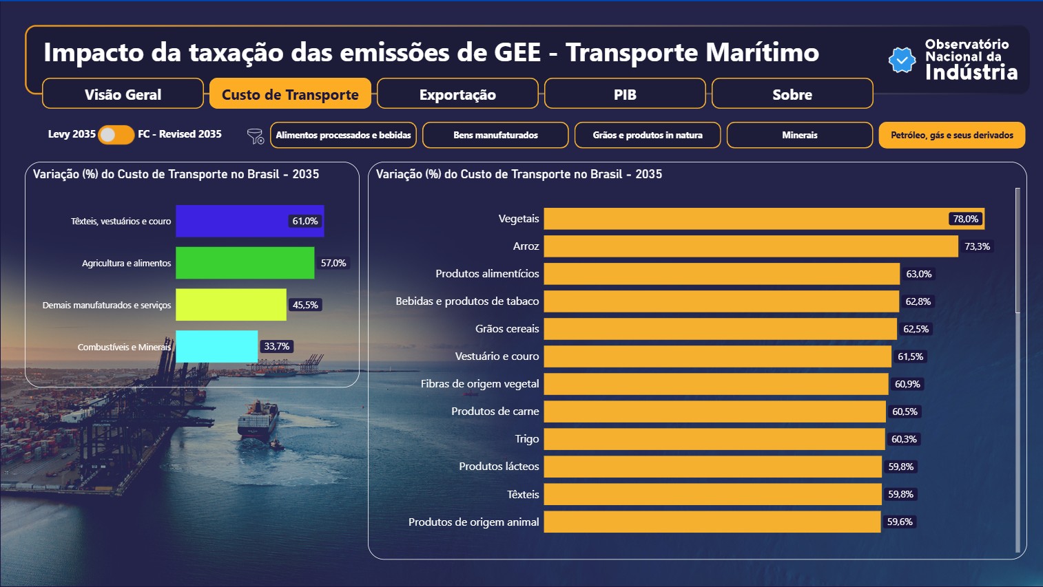 O dashboard demonstra os possíveis impactos na taxação de GEE por transportes marítmos. Projeto desenvolvido com o uso de PowerBi e Figma para prototipação do template.